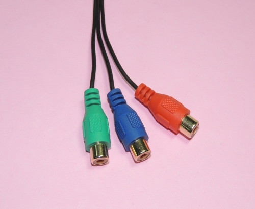 Audio 3.5mm 4 pole Jack Plug to 3x RCA Female AV connector cable (composite video and stereo audio connectors).